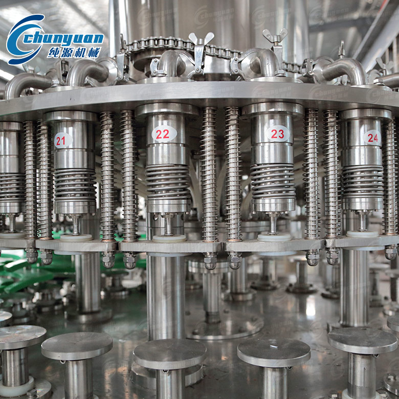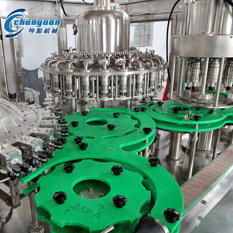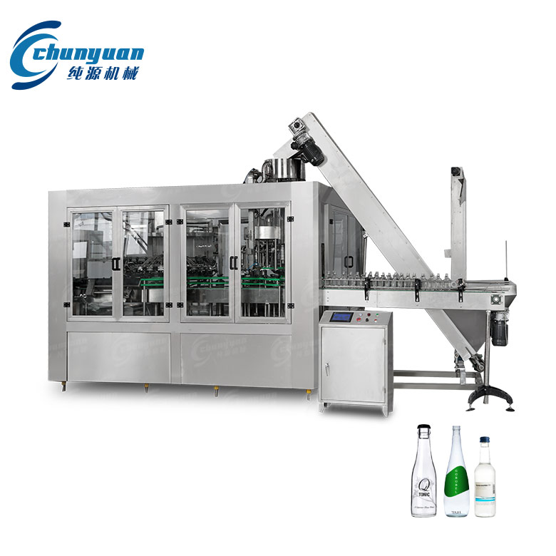 該玻璃瓶含汽飲料機(jī)械集沖洗、灌裝、封口三功能于一體,其適用于玻璃瓶含汽飲料灌裝,如:汽水飲料、可樂、含汽果味飲品等。