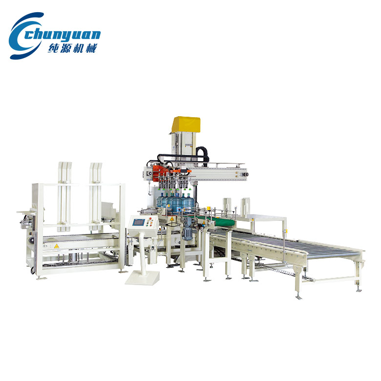 大桶碼垛機是將已灌裝好的5加侖桶按一定排列碼放在托盤(木質、塑膠)上,進行自動堆碼,可堆碼多層,然后自動輸至實托工位,便于叉車運至倉庫儲存。本設備采用PLC+觸摸屏控制,實現(xiàn)智能化操作管理,實現(xiàn)人機對話,可顯示生產速度,故障原因及位置,自動化程度高。簡便、易掌握,可大大地減少勞動力和降低勞動強度。