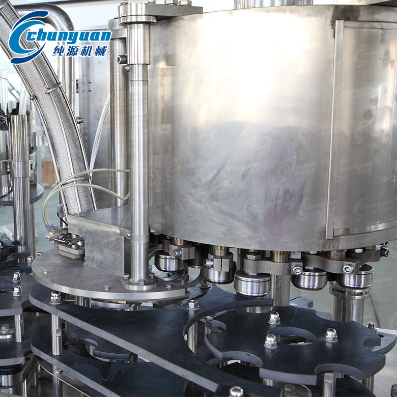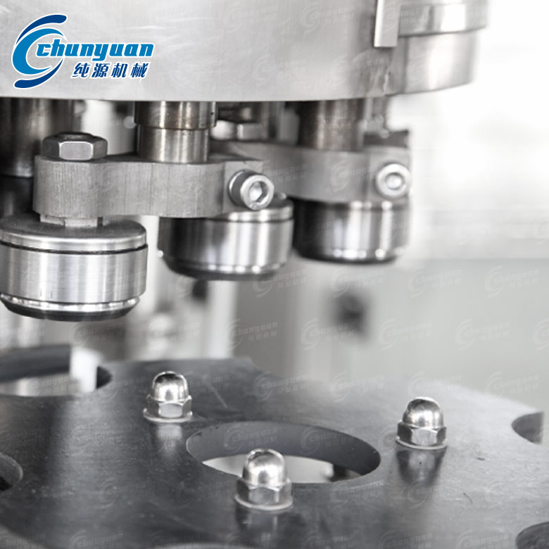 易拉罐椰子汁飲料機械采用常壓灌裝原理,當空罐經(jīng)撥輪進入升降托罐盤后,灌裝閥和空罐對中,空罐升起并密封,同時自動打開灌裝閥的閥口,當灌裝液面堵住閥的回氣管口時停止灌裝。灌好的罐子經(jīng)鉤子鏈送到封口機頭,蓋子經(jīng)送蓋器及壓頭把蓋子送到罐口上,當托罐機構(gòu)升起時,壓頭壓緊罐口,封口輪先預封再實封,罐子封好后被打蓋機構(gòu)的打頭推出,然后進入出罐輸送。